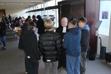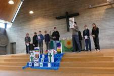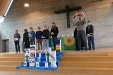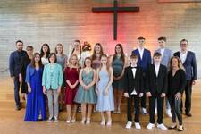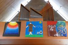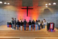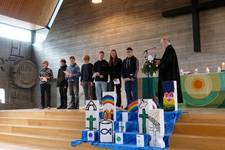 Am 19.11. wurden die sieben Konfirmandinnen und Konfirmanden im Rahmen des Gottesdienstes am Friedenssonntag durch Pfr. Hauser vorgestellt. Von den Konfis wurden Friedensmotive erarbeitet und mit Hammer, Meißel und Farben in Stelen eingearbeitet.