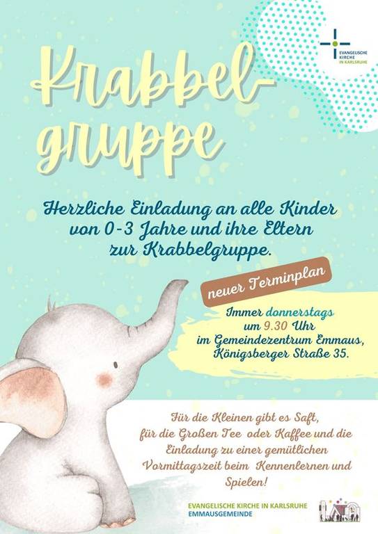 Die Krabbelgruppe trifft sich donnerstags ab 09:30 Uhr im Gemeindezentrum Emmaus zum Kaffee/Tee trinken, Spielen, Singen, Krabbeln und gemütlichem Beisammensein.